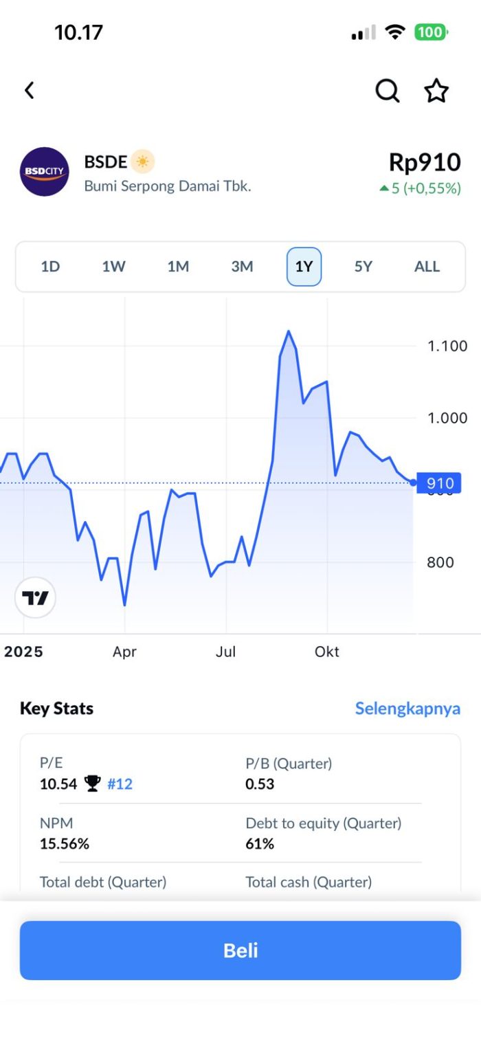 Fokus pada rasio Price to Book Value (PBV). Saat ini BSDE sering diperdagangkan dengan PBV di bawah 0.7x. Secara historis, angka ini menunjukkan bahwa saham tersebut sedang undervalued karena kamu membeli aset perusahaan jauh di bawah harga pasar.